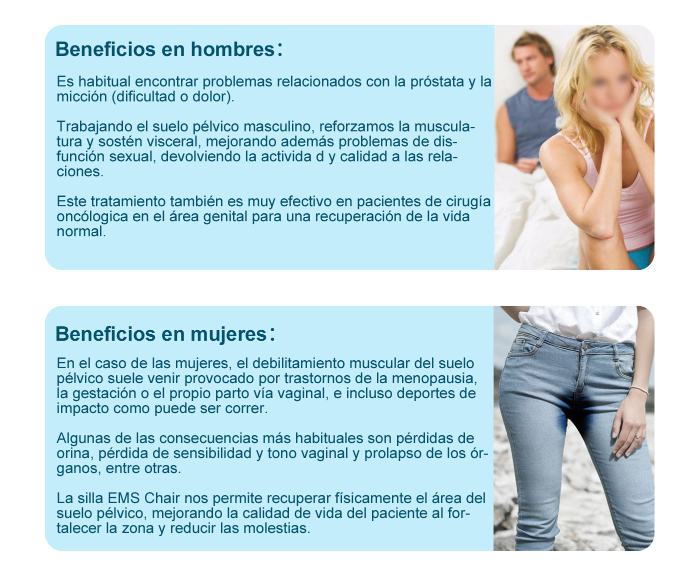 La silla EMS Chair nos permite recuperar físicamente el área del suelo pélvico, mejorando la calidad de vida del paciente al fortalecer la zona y reducir las molestias.